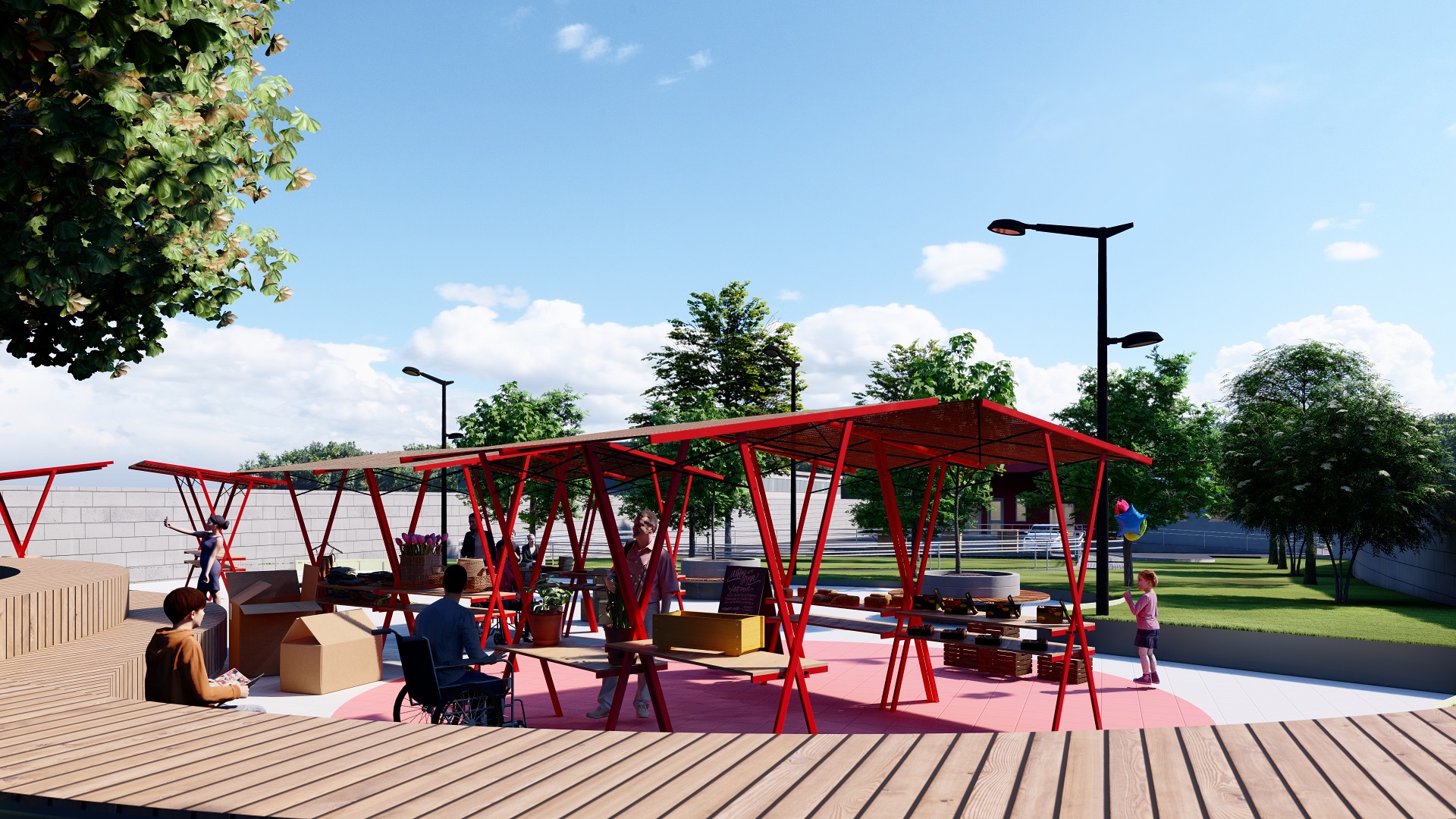 O espaço é complementado com uma cobertura em lona tensionada que oferece espaço de repouso da atividade e um local de trocas de saberes em grupo.