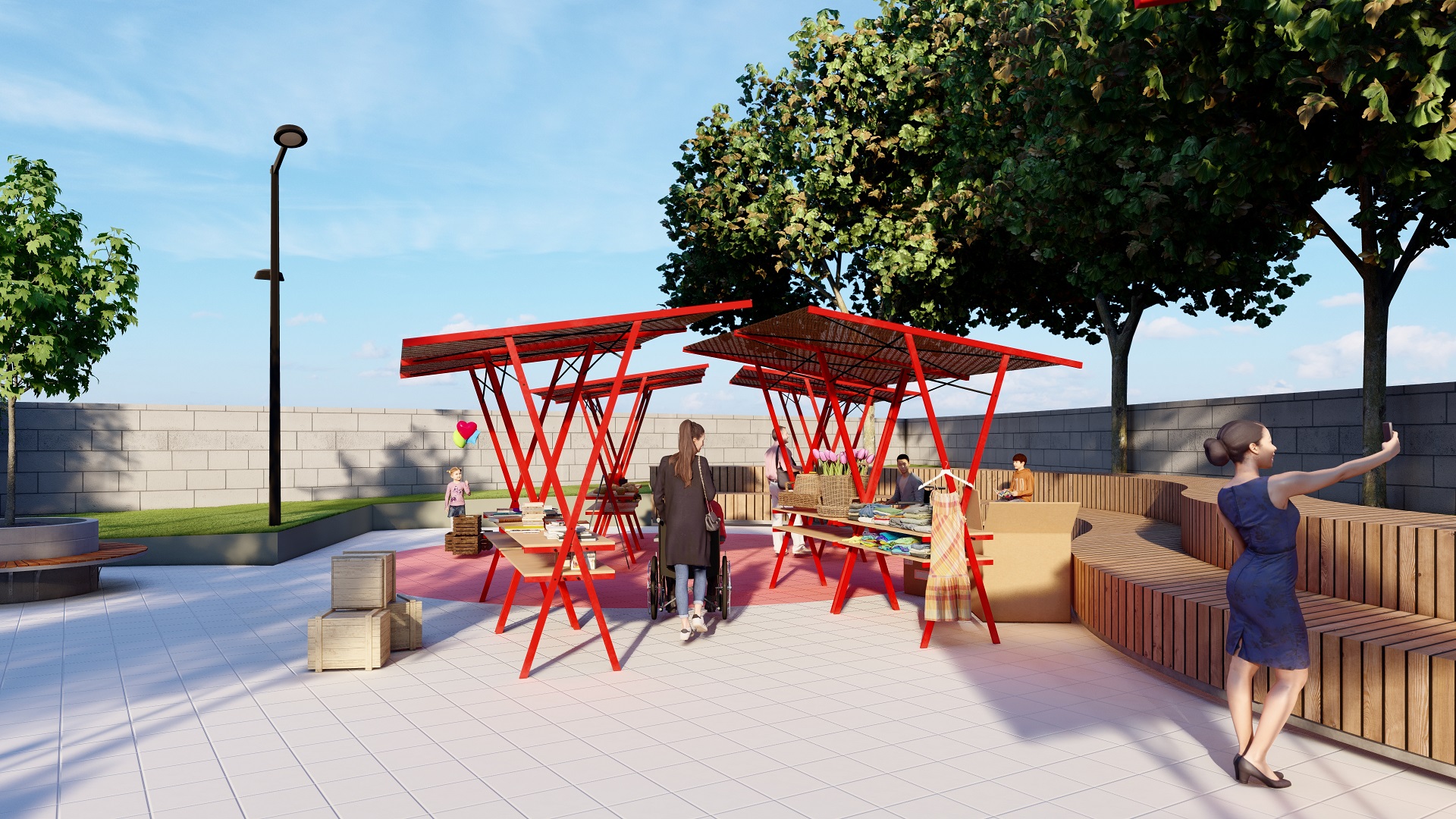 A implantação é fortalecida por uma praça de eventos com capacidade para feiras beneficentes e encontros.